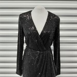 Jerry Cocktail Dress in black with all over sequin design, surplice front, draped detail, and back slit.