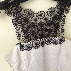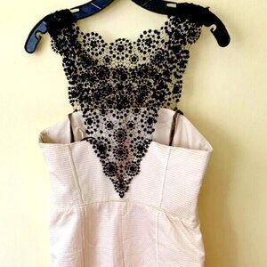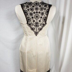 IVORY sleeveless mid-length dress with black lace at shoulders with hook-and-eye closure, boning for support, concealed side zip closure, lining at top, back flap and black lace embellishment at hemline.