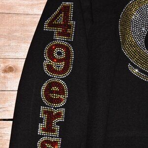 49ers rhinestone bling sweatshirt featuring a beautiful dark red, jet black, gold and diamond clear rhinestone design on front and a coordinating 49ers rhinestone design on the sleeve.