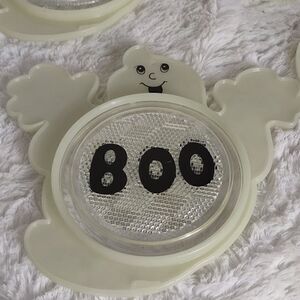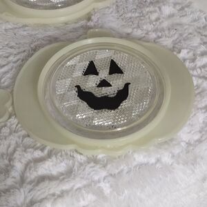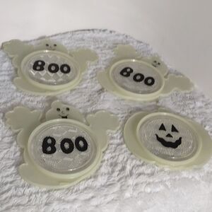 These 3 ghost 1 jack-o-lantern glow in the dark and reflective hanging Halloween decorations measures approximately: ghost 6" x 6-1/2" and jack-o-lantern 4-3/4" x 5-1/4". Made of hard plastic. Pre-owned and in excellent condition. All offers welcome.