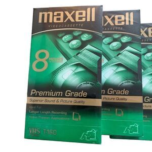 4 Maxell 8 Hour Premium Grade VHS T-160 Video Tapes. All new in original cellophane. Have several blank tapes listed, will gladly bundle.