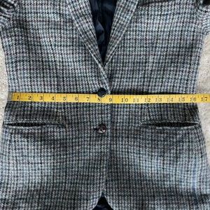 Gorgeous vintage wool tweed blazer with leather covered buttons! Buttons show wear. Tweed appears as a neutral tone from a distance but is made up of purple, navy, and green tones. Approximate measurements in photos. Three pockets; the breast pocket is still stitched shut. No vents. Dry clean only.