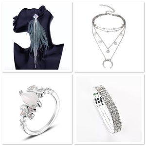 UNIQUE STYLES BOUTIQUE - New 4PC Teal green turquoise Feather Ostrich Faux diamond Rhinestone Bling Long Large dangle drop earrings, silver moon layer dangle drop necklace, 3 row stretchy bracelet & faux moonstone size 7 ring. Bundle set lot. Very BoHo chic hippie love gypsy tribal bohemian sisters free style honey festival babe connection vintage bridesmaid booty flying fairy goddess prom lovely Victoria wedding Michelle Mary raga. **More styles go to "brand" under "Unique Styles jewelry set"