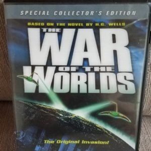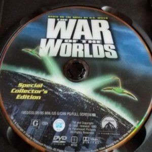 Fans of the H.G. Wells classic will appreciate these two books; a hard to come by CD album of Jeff Wayne musical version; and a DVD of the old classic movie; CD cover has handwritten pencil marks; paperback books have wear as shown; other worn areas in some as shown in photos.