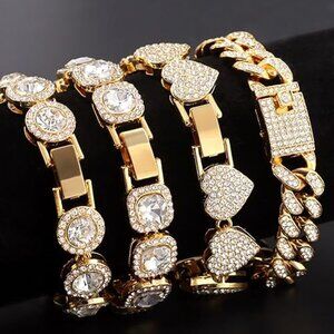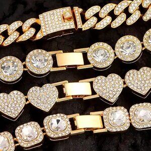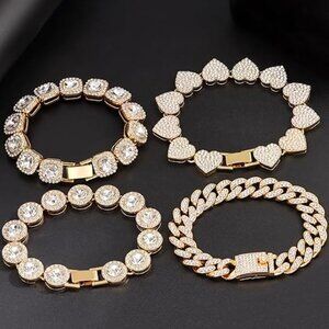 This bracelet set for women includes four unique designs: a sparkling heart bracelet, a square tennis chain, a round tennis chain, and a classic Cuban link bracelet. Each piece measures 8 inches in length. Wear them individually for a subtle touch or layer them together for a bold statement look.