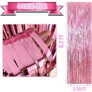 4Pack Pink Foil Fringe Curtain Backdrop,3.28Ftx8.2Ft Metallic Tinsel Foil Fringe