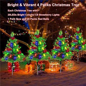 🧿【4-In-1 Solar Small Christmas Tree Lights】4 packs 75cm/29.5inches tall prelit Christmas trees with a solar panel, and each xmas tree with 20 leds C6 colored strawberry lights, 6.56ft lead wire and 6.56ft spacing. Packsage included: 4 packs xmas tree, 80 vibrant red balls, 4 festive bows.