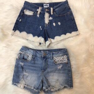 - (2) pairs of Old Navy medium wash shorts. One with bleached scalloped border and spots. One with distressed accents and cotton eyelet lace detail. 100% cotton.