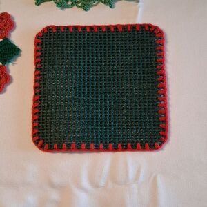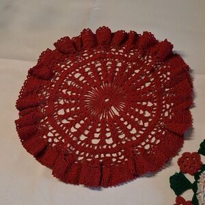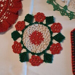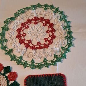 Beautiful 4 pc. set of crochet doilies in red and green. Perfect for adding a festive touch to your decor. Hand crocheted. Non smoking g home.