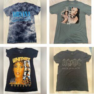 Set of four graphic band t-shirts featuring iconic designs. Includes black, blue, and gray colors.