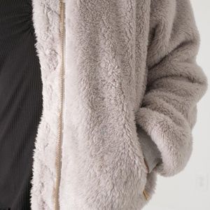 Plush grey fuzzy lined bomber jacket with fabric neck collar, fabric cuff and fabric waistband. Featuring side seam pockets with gold zipper closures and front gold zipper closure.