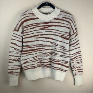 Pull-over sweater with fuzzy texture. Chic zebra print throughout with relaxed fit and straight ribbed hem finish