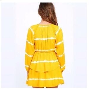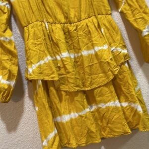 Bring some serious harmony to your wardrobe with the Yellow Tie-Dye Dress! Woven rayon forms an elastic neckline that ties between long, billowy sleeves. Elastic cuffs and waistline refine the silhouette while a tiered skirt offers some flirty flare.