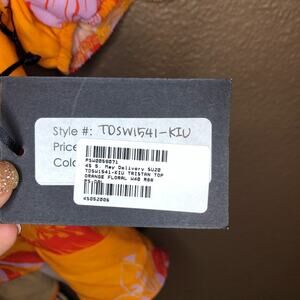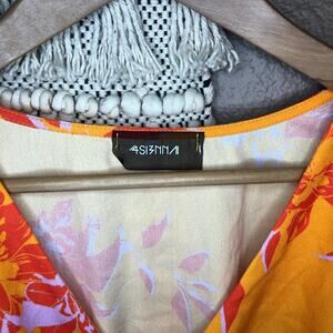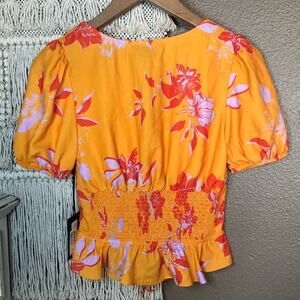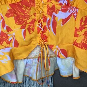 4Si3NNA Lace Up Orange Floral Tristan Top Size small. Faux lace up front and ruched back. Ruffle hem