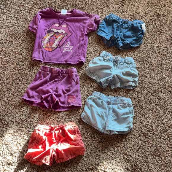 Includes Rolling Stones outfit, 3 pairs of denim shorts (different denim colors), and a pair of orange shorts. All size 4T.