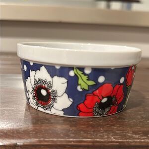 Vintage Georges Briard "Polka Poppy" casserole ramekin bowls, from the 1960s. These bowls feature a dark blue background with white polka dots and red and white poppy designs. They are made of stoneware and were designed for both oven and serving purposes.