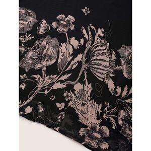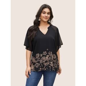 This rare plus size Bloom Chic blouse features a notched neckline with frill trim, flutter sleeves, and a sheer single layer with a smooth lining that is 2 inches shorter for a light, airy drape. The boho floral border print brings easy elegance to casual or dressy looks.