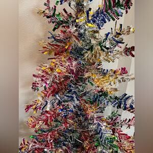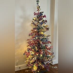 Beautiful 4 foot Christmas tree with multicolored tinsel throughout as well as some clear spotted white pieces. It has a silver, blue, green, gold, red and a purple pink color. It is pre-lit with warm white lights. I used it for a few weeks last Christmas. It is close to new. It will ship in its original box.