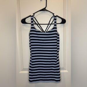 Experience the perfect blend of style and comfort with this fitted tank top from lululemon athletica. Designed in classic black and white, this sleeveless top features a striking backless design with criss-cross straps, ideal for yoga or workouts. Its form-fitting silhouette ensures a flattering fit for any active occasion.
