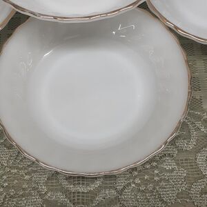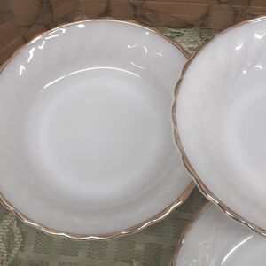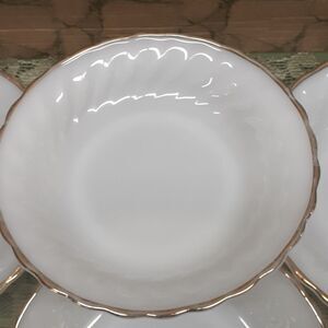 4 pc. Vintage Anchor Hocking Fire King Milk Glass Salad Bowls with Gold Trim 7.5” X 1.5" H. Bowls are all #14. Suburbia. Oven Proof. Preowned. Very good conditon. No chips or cracks. Gold trim does show slight wear. Beautiful set to serve soup/salad/desert and more. (Please do not bundle any other items with these as these already weigh 5 pounds and our limit is 5 pounds in the box. Thank you.)