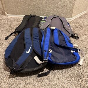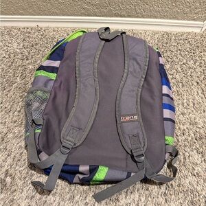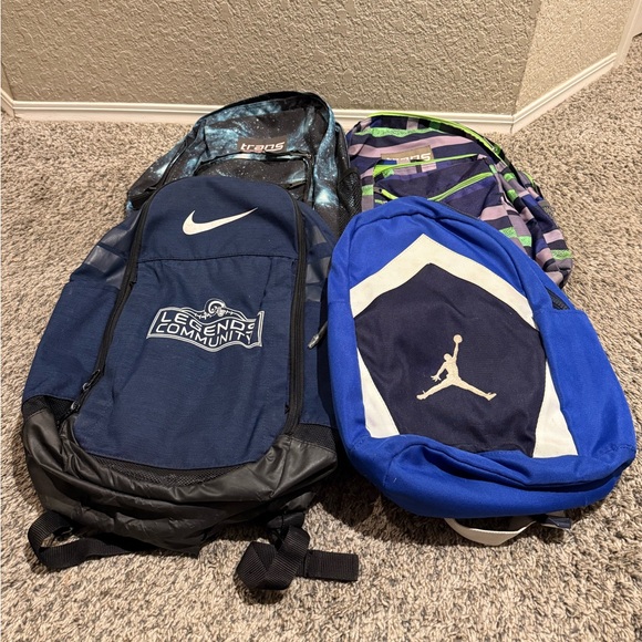 Four piece combo backpack set. Includes two trans backpacks one galaxy print, the other multicolor strip print. One limited edition Los Angeles Rams backpack, and a Jordan backpack. All in mint condition straps working on each. Smoke free home.