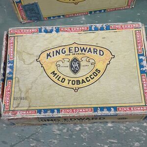 4pc. Bundle of vintage King Edward cigar boxes. These do show some wear on edges and corners Has writing on top of one box Some do have some stain inside box as shown in pictures. One does have a loose lid, and one has a taped lid. All in preowned condition. These measure 9" X 6" each.