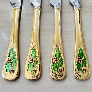 Beautiful vintage holiday flatware knives featuring a gold-electroplate handle with enamel holly leaves and berries, perfect for Christmas table settings, entertaining, or as replacements for a holiday flatware set.