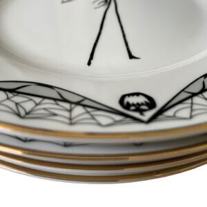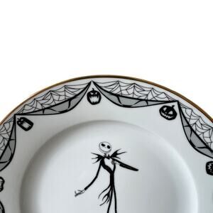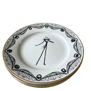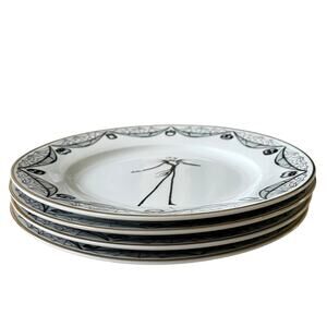 This is a set of 4 Disney Tim Burton's The Nightmare Before Christmas salad plates. They are beautifully detailed and designed. The 8" plates feature Jack Skellington and are black and white with gold trim. Hand wash is recommended due to the gold trim.