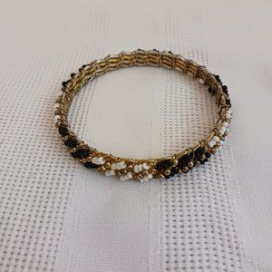 Silver Tone Chain Necklace with shell pendant, Stretch Bracelet with faceted glass and acrylic beads, Gold Tone Metal Bangle Bracelet with black and white wire-wrapped seed beads, Round Black Clip On Earrings