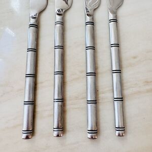 4pc Pier 1 Steak Knife 9” 18/8 Stainless Serrated Satin Ribbed/Bamboo Handle
