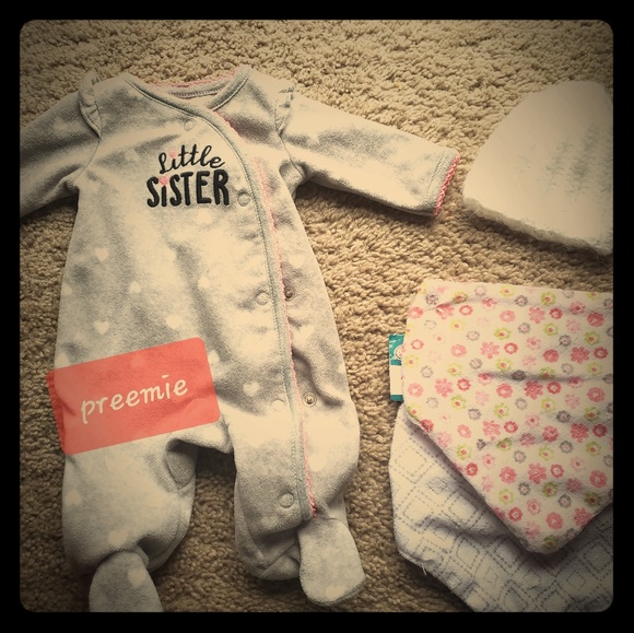 Preemie, fuzzy sleeper, 2 bibs, 1 hand knitted hat