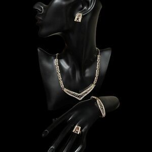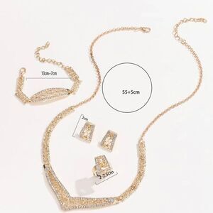 This jewelry set is stunning! It is encrusted with clear, sparkling rhinestones along a gold plate. The necklace measures approximately 22" long + 2” extender. Bracelet 6” + 3” extender. It is perfect for weddings, proms, formals, parties, pageants, and more. It coordinates with any color or style wedding dress or formal ensemble.