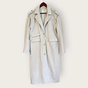 Meet your jacet of all trades: whatever your style, they’re up to the task. Keeping warm while looking cool? That’s their specialty. Mixing classic tailoring with key trend pieces, 4th + Reckless is a UK-based design house that focuses on the head-to-toe look with pieces for day to night, work and every day. With such inspired and versatile basics, it's easy to mix and match to achieve a style for any occasion. This coat is everything you need and more. Long line style with an oversized collar and shoulder detailing. Front flap pockets with a button front closure. The color is tan with a grey tone. It is in very good pre-owned condition. Maybe some very light pilling under the arms. This is meant to be oversized so if you like a slimmer fit, I would size down. Very scandi vibes.