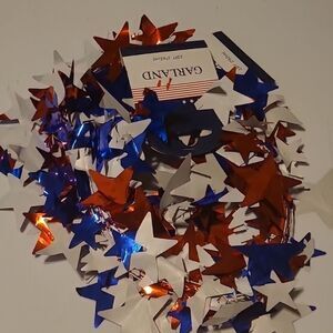 Pre-owned in new unused condition. small 3 panel sign, 1 4th of July Letter banner, 1 package of gel window clings, 2 25 ft foil star garlands, 2 packages of 3 swirl flag decorations, 1 package of glittery star table scatter and one balloon weight.
