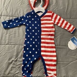 4th of July One Piece with Bib! It has buttons that goes all the way down! Unisex outfit, red, white and blue.