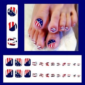 Short Square Fake Toenails American Flag with Silver Glitter Rhinestones