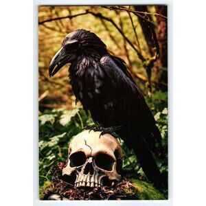 This striking 4x6 glossy color photograph captures a dramatic scene of a raven perched atop a weathered human skull surrounded by lush forest greenery. The image evokes themes of mystery, nature, and mortality with vivid detail and rich contrast. The raven's glossy black feathers and the cracked texture of the skull create a compelling visual narrative that appeals to collectors of gothic, wildlife, or symbolic art photography.