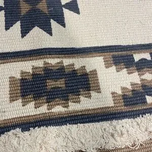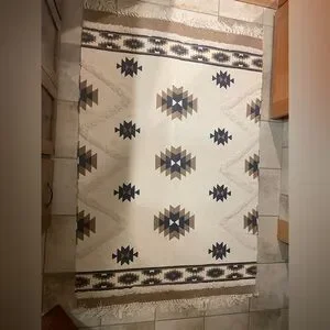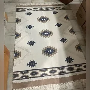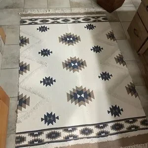 4 x 6 rug. Super cute Aztec pattern area rug with geometric patterns. Features blue and brown designs on a cream background. 100% cotton.