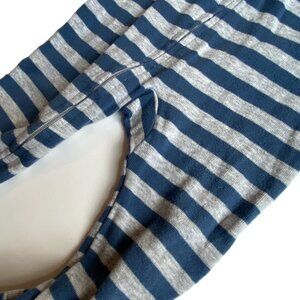 Navy blue and grey stripe with red trim; red firetrucks applique