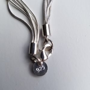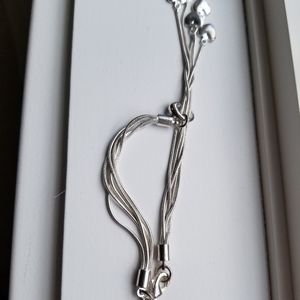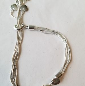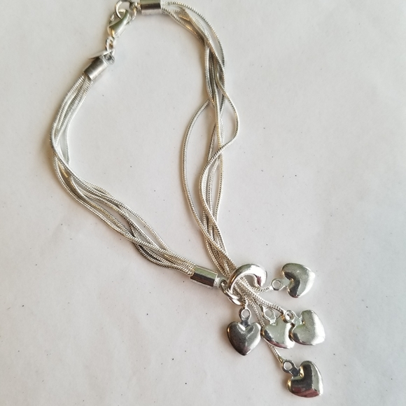 Multi stand snake chain bracelet ending with flexible slip knot and a spray of five dainty little hearts. Fits up to 8" wrist. New, Never Worn.