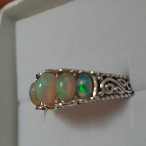 5 five fire opals, glued. Zero backing set in size 10 sterling ring. pics are with and without flash. incredible looking in the sun and indoors. super nice fire from all directions. total attention getter is not worthy of the setting, according to my Jeweler. they offered 175 for the stones, and I keep the silver ring. I've commissioned Jewelery before and never came out on top when selling. so big, no thanks there.