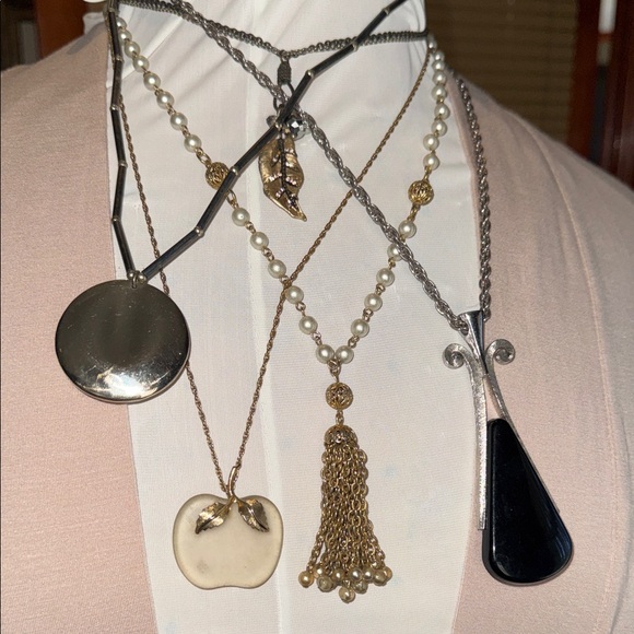 An assortment of necklaces. Gold chain with frosted apple pendant, peart and tassel necklace, gold leaf multistring, silver with black stone pendant and silver with hidden perfume pomade.