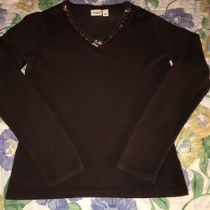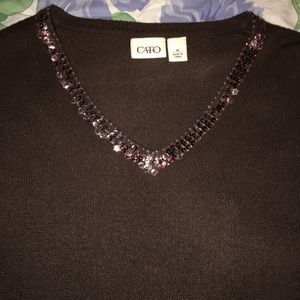 Brown acrylic v-neck sweater with sequins & beads around neckline. May run a bit small. Bust is 36” unstretched.