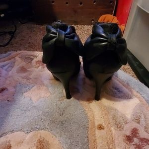 They're black leather a little wear and tear but beautiful and elegant they can be sexy or professional with a bow on back they are cute but I have back issues now so bug bye heels