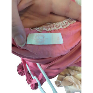 GUC Dollcake Raspberry Parade dress. Pink halter style bodice with large tulle flowers around the hem. White lace accent on the back and ties. Fully lined. Listing in GUC for small snags on bodice/waistline