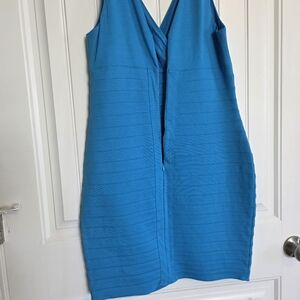 Gorgeous blue banded dress from Express. Features a back zipper with hook and eye closure.