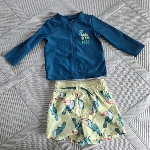 Excellent condition swim set from Carter's. Perfect for your next beach trip or vacation! The rash guard is long sleeves with a zipper and the trunks have a drawstring and no underwear lining. Both pieces are UPF 50+.