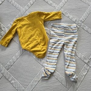 Adorable 2 piece set. Long sleeve onesie that says "See you later alligator) with three buttons at the bottom and footed striped pants.