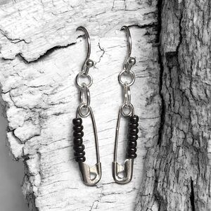 Small Silver Safety Pin Punk Dangles with black seed beads. Look at the measurements! Small.