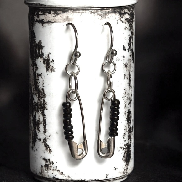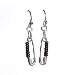Small Silver Safety Pin Punk Dangles with black seed beads. Look at the measurements! Small.